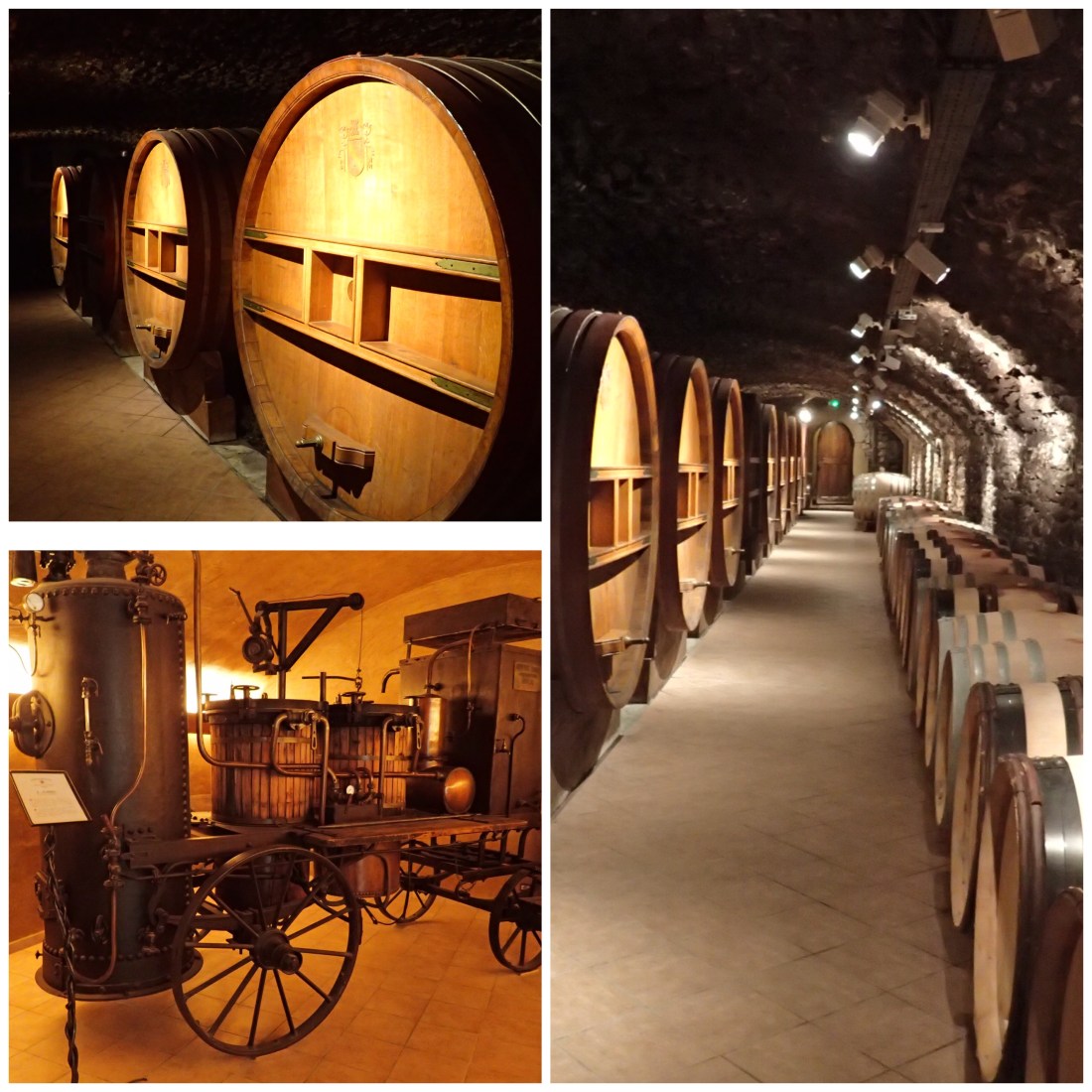 The second winery, the largest, grew all of the thirteen grapes that may be included in a Châteauneuf-du-Pape blend. Before tasting we walked among the barrels and learned a bit about some of the older machinery that years ago was pulled from vineyards to vineyard to bottle the wine.