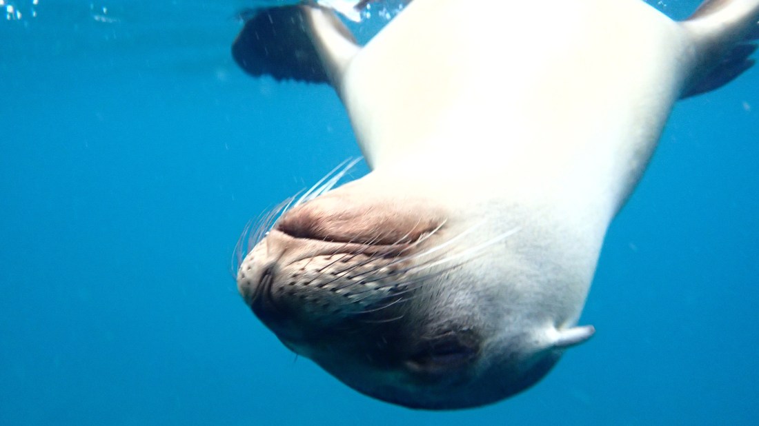 On the last full day of our cruise, we had to don our wetsuits by 7:30am and hit the water. It was an overcast morning which didn’t make the water look too appealing. But as our boat got near the rocks where the adult sea lions rested after a night of fishing, the juvenile sea lions made a beeline for us. One by one we rolled off the side of the zodiac skiff into the cold water and into the midst of a teenage sea lion party.