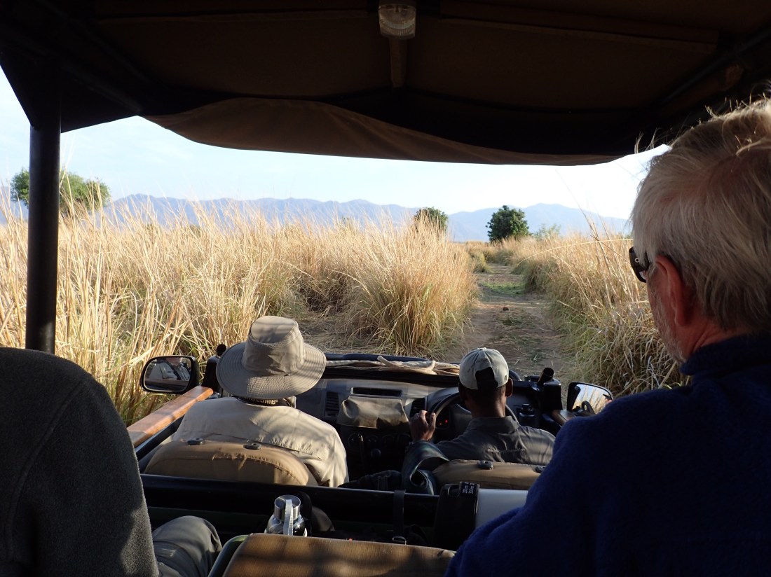 By 6:30 we loaded into the jeeps and began the morning game drive. Peter road shotgun, a Danish couple in front, and Malcolm and me behind in a vehicle that could hold seven. Our guide, Mundoga, a slight, fast talking guy, kept up a happy chatter, exchanging jokes with us and laughing at our responses. A different Mundoga emerged when he was tracking animals — focused, intense and alert, leaning over the side of his door, studying tracks. Once or twice, he grabbed his rifle and walked a ways, leaving us in the safety of the Jeep. Without him we would have seen little, even if the animals had stood up on their hind legs and waved their arms.